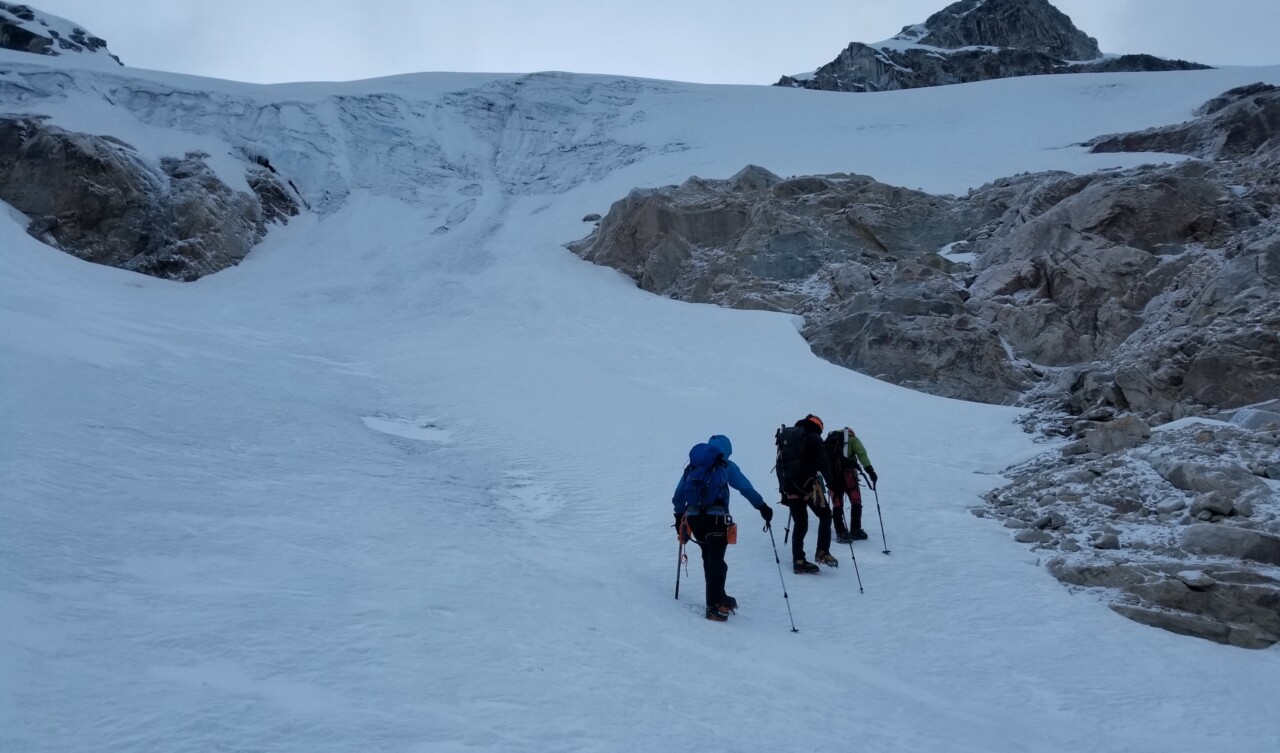 This course is designed for progression on snow and alpine ice with crevasses where route finding is important and complex. The general angle is less than 50° and the rating of the route is between Little Difficult (PD) and Difficult (D).